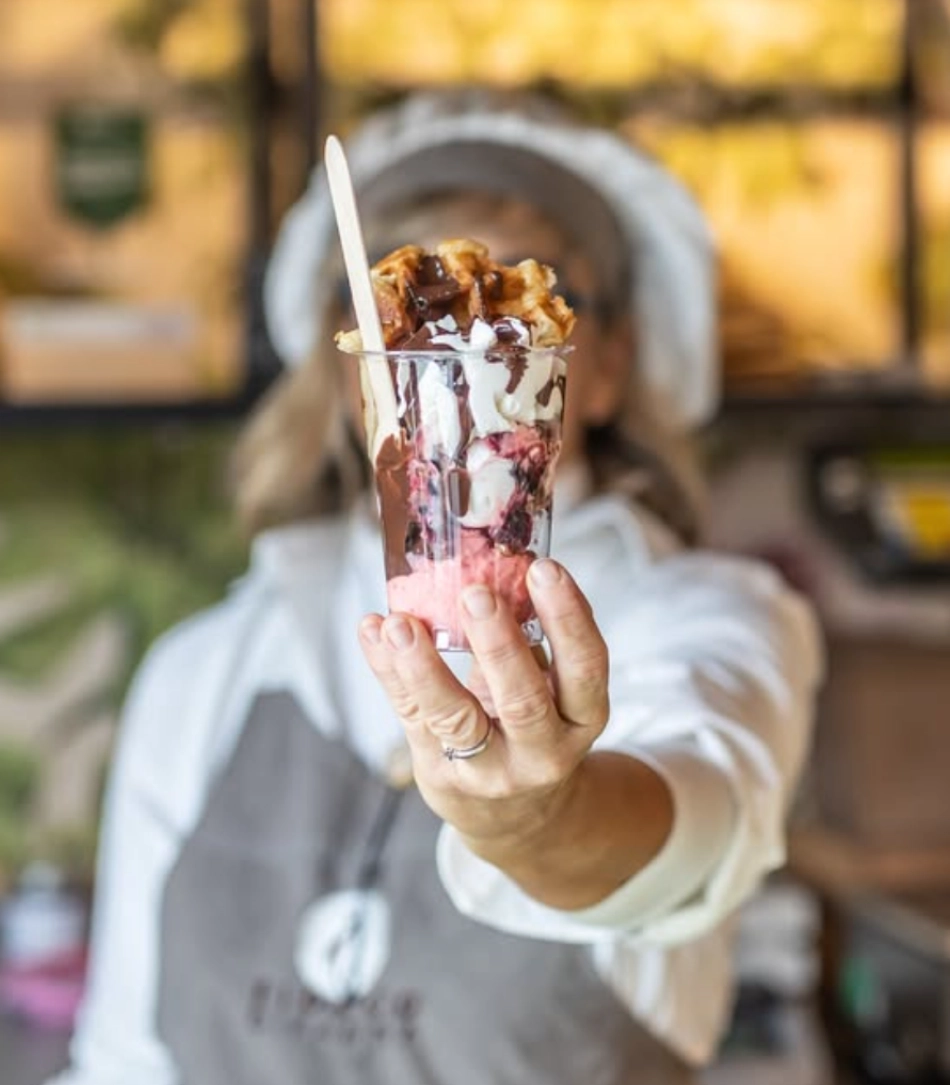 Waffles dorati e fragranti, serviti con gelato, panna montata e una colata avvolgente di crema. Un contrasto di temperature e consistenze che conquista al primo morso.